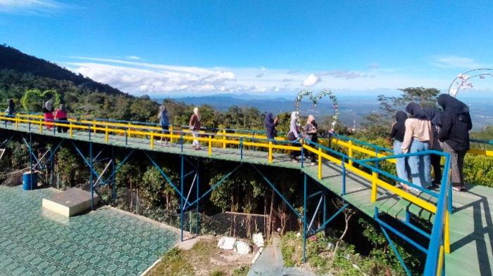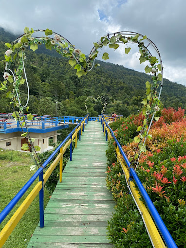 Banyak spot foto yang menarik, mulai dari jembatan biru yang ujungnya berada di bibir bukit. View Gunung Karang akan sangat eksotis jika dilihat dari sini. Kemudian ada spot ayuna bunga dan romantic love untuk Teman Traveler yang mau mengabadikan momen bersama pasangan.
