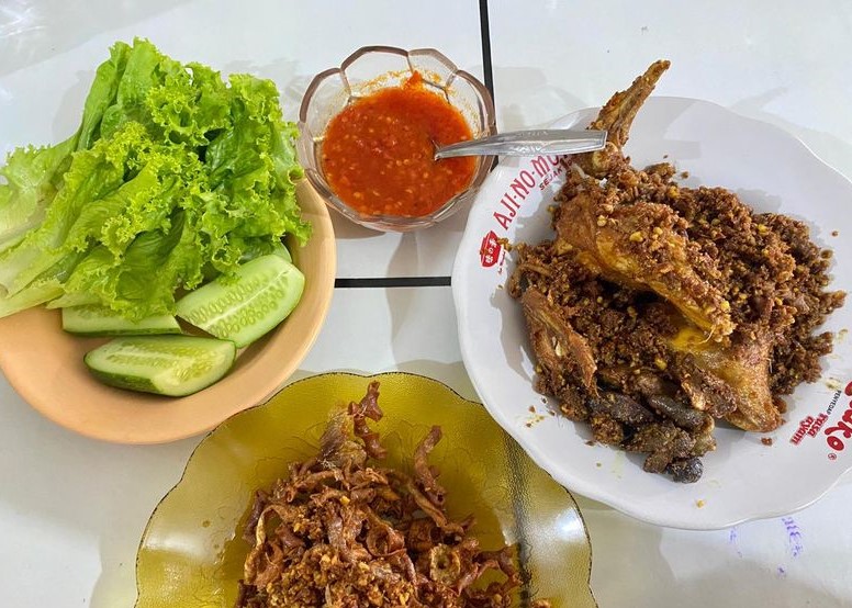 Ayam goreng ini disajikan dengan serundeng kelapa yang melimpah. Rasanya gurih renyah dan wangi aromanya. Untuk sambalnya menggunakan cabai rawit hijau dan terkenal pedas nampol. Satu porsinya dibanderol Rp 15 ribuan saja.